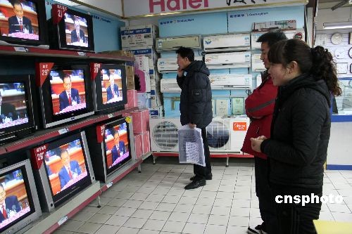2009年3月5日上午,江苏省大丰市一家超市家电部,顾客在收看温家宝总理作政府工作报告。中新社发 周古凯 摄