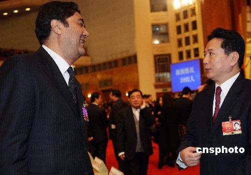 3月5日上午,十一届全国人大二次会议在北京人民大会堂开幕,全国人大代表、山西省副省长李小鹏(右)会前与新疆维吾尔自治区主席努尔·白克力交谈。中新社发 任晨鸣 摄