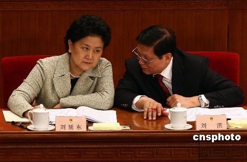 3月5日上午,十一届全国人大二次会议在北京人民大会堂开幕。国务委员刘延东(左)和北京市委书记刘淇在主席台上交谈。中新社发 杜洋 摄