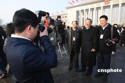3月5日,第十一届全国人大二次会议开幕会在北京人民大会堂隆重举行。图为人大代表柳传志在会前与记者合影。 中新社发 李松 摄