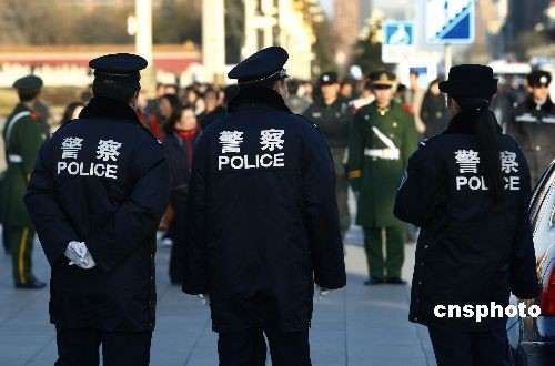 3月5日,北京警方在天安门广场周边巡逻,确保“两会”安全。中新社发 郑雄增 摄