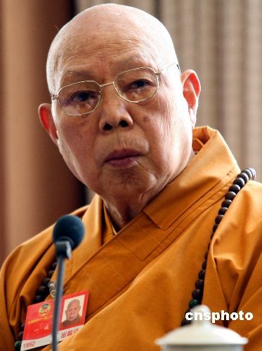 在北京参加“两会”的全国政协委员一诚大和尚,3月5日下午主持宗教界小组讨论会。中新社发 宋吉河 摄