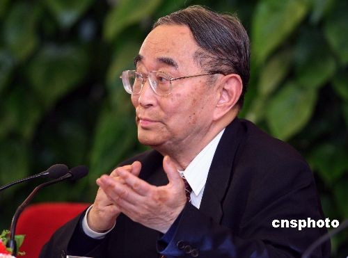全国政协常委、著名经济学家厉以宁在3月6日下午举行的全国政协十一届二次会议记者会上说,当前楼价居高不下,原因是地价高。他还回答了关于上调资源增值税的说法和提高劳动收入在国民收入中分配比例等问题。中新社发 宋吉河 摄