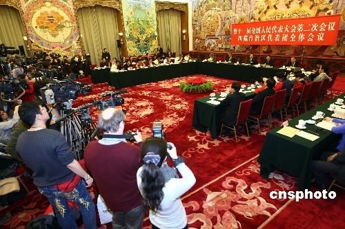 3月6日,十一届全国人大二次会议西藏自治区代表团在人民大会堂举行全体会议,吸引众多中外媒体的记者。中新社发 杜洋 摄