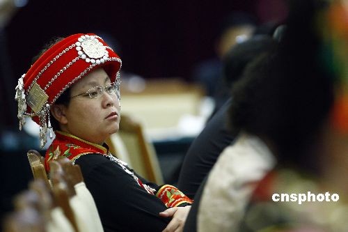 3月7日,十一届全国人大二次会议继续举行小组会,审议政府工作报告。在云南代表团小组讨论中,彝族代表杨亚梅身着节日盛装出席小组会。中新社发 盛佳鹏 摄