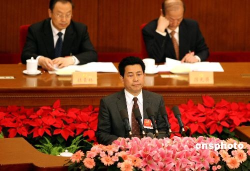 3月7日,全国政协十一届二次会议在人民大会堂举行第二次全体会议。图为中国侨商联合会常务副会长、深圳市工商联副主席黄少良作大会发言,他建议银企“联手”应对金融危机,实现企业跨越式发展。中新社发 傅丹丹 摄