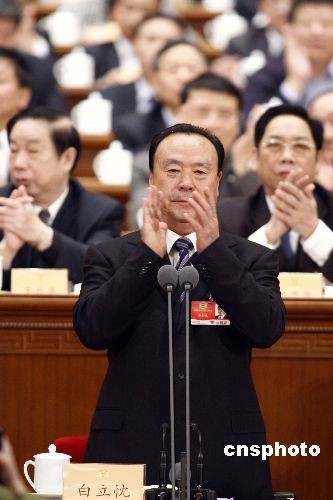3月8日,全国政协十一届二次会议第三次全体大会在北京人民大会堂举行,主持会议的全国政协副主席白立忱向全体女委员表示节日的祝贺。中新社发 盛佳鹏 摄