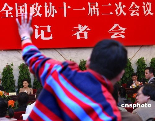 全国政协十一届二次会议3月8日就2010年5月上海举办世界博览会举行记者会,香港大公报记者踊跃提问。万季飞、周汉民、成岳冲、杨澜等四位全国政协委员回答了筹备中的上海世界博览会资金来源,筹备进度情况,外界关注的美国、台湾参展情况,金融危机的影响及民营企业参展情况等问题。与会中外记者表现出极大关注,争相提问。中新社发 宋吉河 摄
