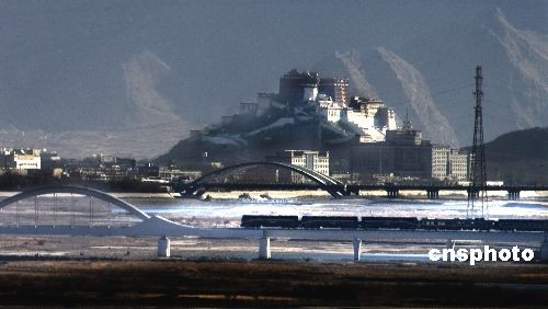 3月9日,青藏铁路上的列车驶过拉萨城西侧的拉萨河大桥。据悉,有关方面争取今年“五一”前开行青藏铁路五星级豪华列车。目前,已经有不少旅行社联系青藏铁路五星级列车,客源情况很好。中新社发 廖攀 摄