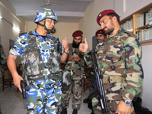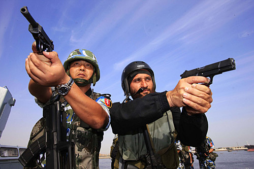 3月7日,中国海军特战队队长孙浩(左)参加“和平—09”多国海上联合军演时与巴基斯坦海军特战队员交流。