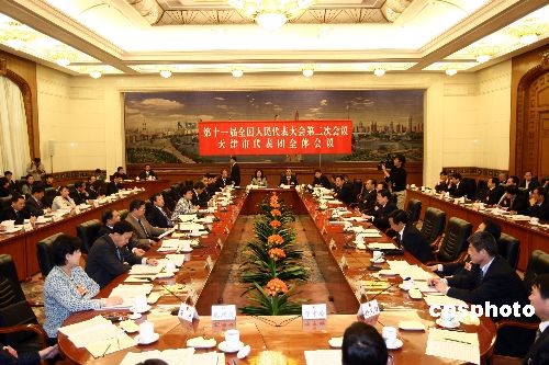 3月9日,全国人大天津代表团在人民大会堂举行全团会议,审议全国人大常委会委员长吴邦国全国人大常委会工作报告,并向记者开放。中新社发 杜洋 摄