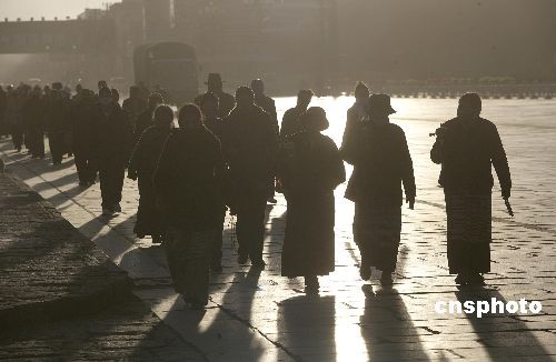 3月10日清晨,西藏拉萨布达拉宫门前来自各地的信众络绎不绝。中新社发 刘震 摄