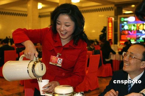 3月10日下午,十一届全国人大二次会议在北京人民大会堂举行第三次全体大会,听取最高人民法院和最高人民检察院的工作报告。会前,上海代表团的打工妹代表朱雪芹临时“改行”,热情地为其他代表沏茶倒水。中新社发 任晨鸣 摄 点击进入2009两会图片报道专集