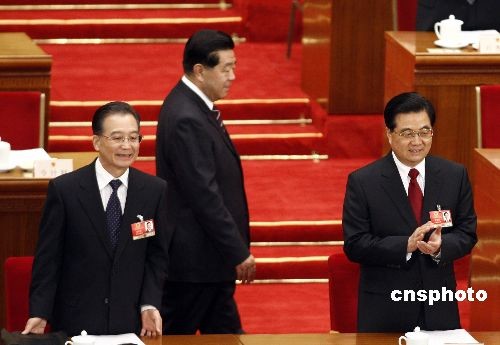 3月10日,十一届全国人大二次会议举行第三次全体会议,最高人民法院院长王胜俊、最高人民检察院检察长曹建明分别作工作报告。图为国家主席胡锦涛、国务院总理温家宝、全国政协主席贾庆林出席全体会议。中新社发 盛佳鹏 摄