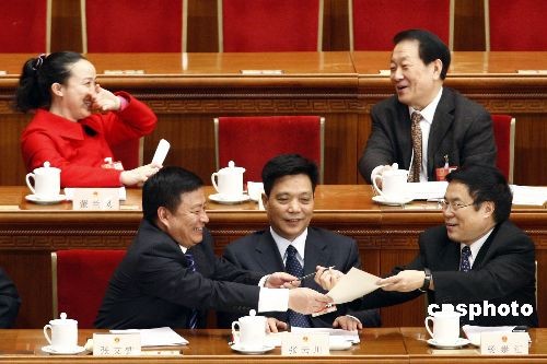 3月10日,第十一届全国人民代表大会第二次会议在人民大会堂举行第三次全体会议,听取最高人民法院院长王胜俊作最高人民法院工作报告;听取最高人民检察院检察长曹建明作最高人民检察院工作报告。图为会议开始前已在主席台就坐的人大代表交谈。中新社发 盛佳鹏 摄