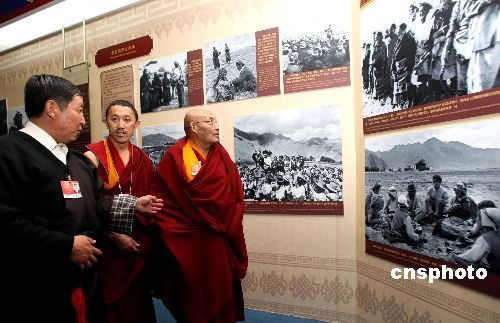 3月11日,参加全国政协会议的宗教界委员参观在北京民族宫举办的西藏民主改革50年大型展览。中新社发 傅丹丹 摄