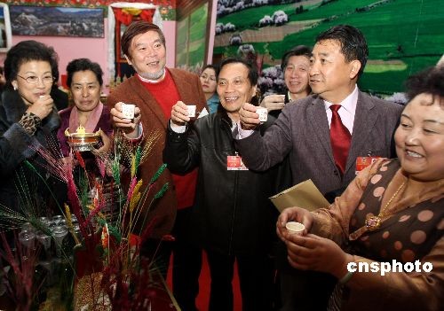 3月11日,参加全国政协会议的文艺界委员参观在北京民族宫举办的西藏民主改革50年大型展览。图为委员们在西藏民居风格的布景馆里共饮酥油茶。中新社发 傅丹丹 摄