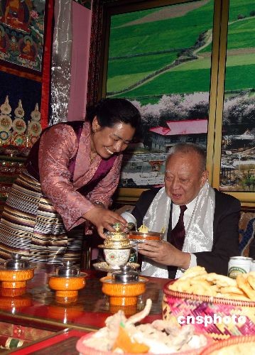 3月11日,参加“两会”的全国政协副主席董建华,前往北京民族文化宫参观“西藏民主改革50年展览”。图为董建华在参观时感受藏族民俗。中新社发 张宇 摄