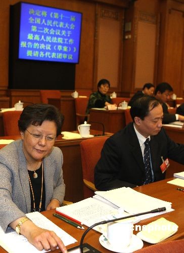 3月12日上午,十一届全国人大二次会议第三次主席团会议在北京人民大会堂举行。会议经过表决,决定将关于全国人大常委会工作报告的决议草案、关于最高人民法院工作报告的决议草案、关于最高人民检察院工作报告的决议草案提请各代表团审议。图为主席团成员范徐丽泰按表决器。中新社发 任晨鸣 摄