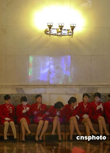 3月12日,全国政协十一届二次会议举行闭幕大会。大会开始前,服务人员在人民大会堂的椅子上休息。中新社发 盛佳鹏 摄