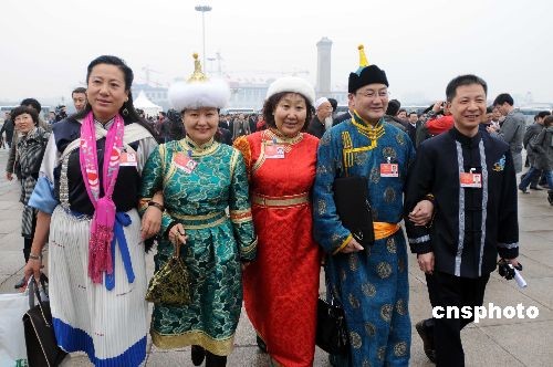 2009年3月12日上午,中国人民政治协商会议第十一届全国委员会第二次会议圆满完成各项议程后在人民大会堂闭幕。图为在人民大会堂前的少数民族代表。中新社发 宋健浩 摄
