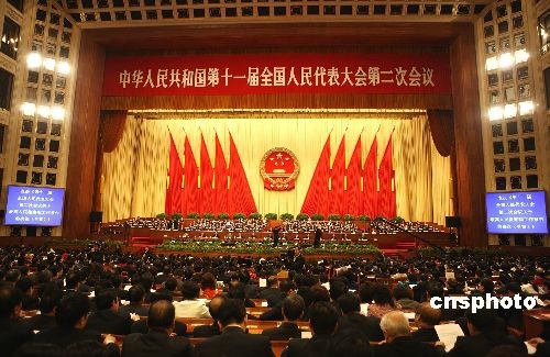 3月13日上午,第十一届全国人民代表大会第二次会议在北京人民大会堂举行闭幕会,与会代表表决通过了关于政府工作报告的决议草案、关于2008年国民经济和社会发展计划执行情况与2009年国民经济和社会发展计划的决议草案、关于2008年中央和地方预算执行情况与2009年中央和地方预算的决议草案、关于全国人民代表大会常务委员会工作报告的决议草案、关于最高人民法院工作报告的决议草案、关于最高人民检察院工作报告的决议草案后闭幕。中新社发 任晨鸣 摄