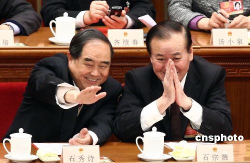 3月13日,十一届全国人大第二次会议在人民大会堂举行闭幕会,全国人大财政经济委员会主任委员石秀诗、贵州省委书记石宗源在主席台上和主席台下的代表打招呼。中新社发 杜洋 摄