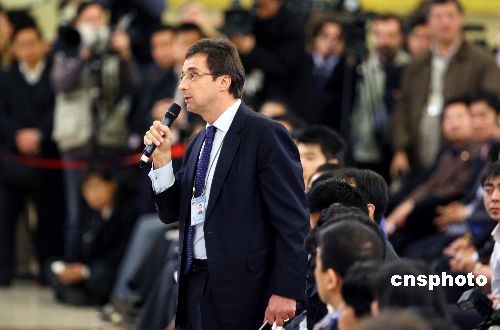 3月13日,十一届全国人大二次会议闭幕后,国务院总理温家宝在北京人民大会堂与中外记者见面。美国《华尔街日报》记者就中国分散投资风险的策略、能否保证中国不会让人民币贬值、中国会不会向国际货币基金组织提供资金支持,向温总理提出三问。中新社发 傅丹丹 摄