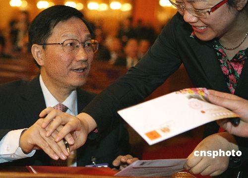 3月13日上午,第十一届全国人民代表大会第二次会议在北京人民大会堂举行闭幕会,列席会议的财政部部长谢旭人成为代表索要签名的热门人物。有代表戏称,因为“财神爷”的签名一字千金。中新社发 任晨鸣 摄