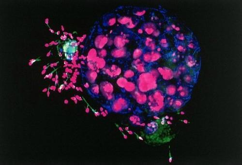 人类胚胎和精子:这张色彩艳丽的美丽图片,是利用共聚焦显微镜拍摄的。胚胎和精细胞核呈紫色,而精子的尾巴是绿色。蓝色区域是缝隙连接(gap junction),它们把细胞彼此联系在一起。