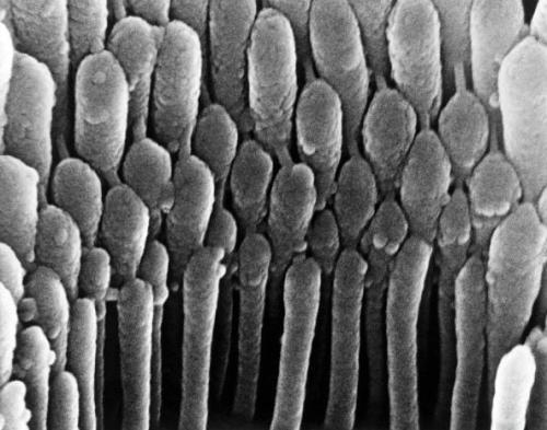 耳毛细胞:这张图片看起来好像是在耳朵里面对耳毛细胞进行近距离观察时拍摄的。耳毛细胞的主要功能是发现对声震作出反应时产生的机械运动。