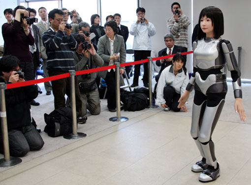 日本科学家最近展示了一名机械黑发美女,她不仅能说话,可行走具有丰富的表情,还能在舞台上走猫步。这个外表亮丽的类人机器人名为“HRP-4C”,它的体内装有30个发动机,能够帮助它行走和移动手臂,面部的8个发动机则赋予它愤怒、惊讶等表情。
