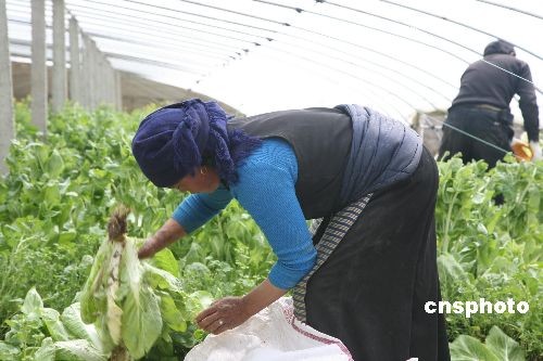 近年来,用温室大棚种植蔬菜在西藏日益推广。在强烈的日光照射下,大棚内温暖如春。就是在青黄不接的冬春时节,大棚内都可生长各种新鲜蔬菜供应市场。图为3月17日拉萨近郊曲水县的一对藏族夫妇在收获大白菜。中新社发 王林 摄
