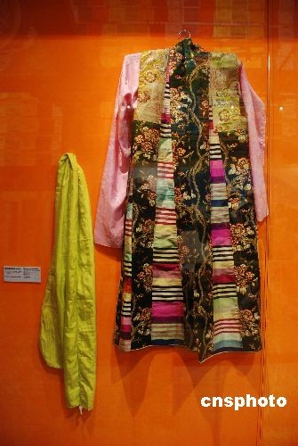 为期五天的“雪域风情——藏族非物质文化遗产精粹展”三月二十日下午在澳门综艺馆开幕,在西藏服饰展区展出了一件十四世达赖一九五二年赠送中央人民政府的藏式织锦女袍。中新社发 毕永光 摄