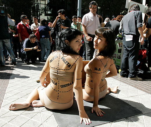 当地时间3月19日,来自AnimaNaturalis动物保护组织的智利美女在首都圣地亚哥举办了一场别出心裁的“裸身切割”活动,呼吁民众保护动物。