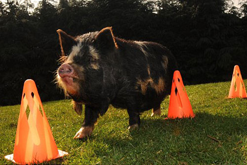 现在“苏”已学会按照指令与人握手,通过隧道、在圆锥体周围绕行,爬上坡道,甚至能完成从一数到八的数数。“苏”的主人温迪-斯科达摩里称,“苏”很有天赋。她相信,“苏”不仅能在灵活性测试中击败犬类,而且能像一部电影中的明星猪那样学会如何管理羊群。