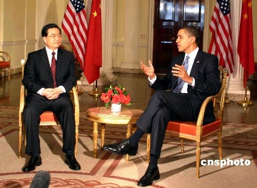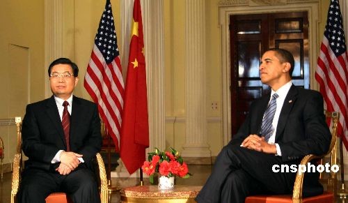 中国国家主席胡锦涛英国当地时间四月一日下午在伦敦首次会见美国新任总统奥巴马。胡锦涛说,中方愿同美方一道,共同推动中美关系更大发展,我也愿意同奥巴马总统建立起良好的工作关系和个人友谊。