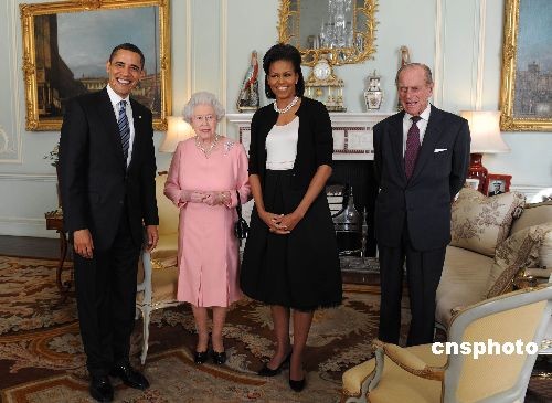 图:英国女王夫妇会见美国总统奥巴马夫妇