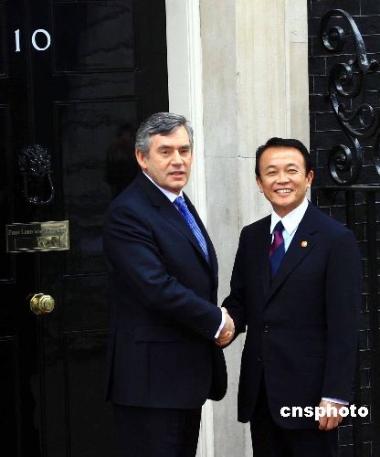 当地时间4月1日下午,英国首相布朗在唐宁街10号会见日本首相麻生太郎,图为布朗在门口迎接麻生太郎。中新社发 李鹏 摄