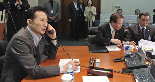 4月5日,韩国总统李明博在首尔的青瓦台总统府接听有关朝鲜发射火箭的电话汇报。