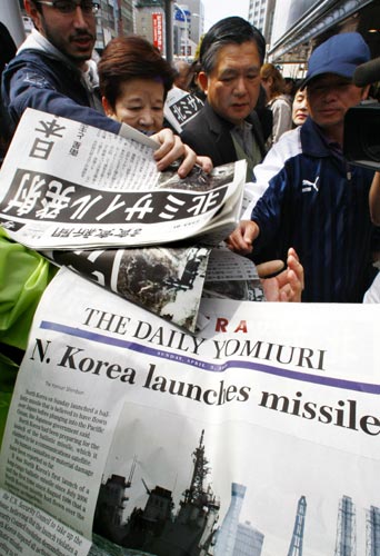 日本民众关心当地媒体对朝鲜发射火箭的报道。