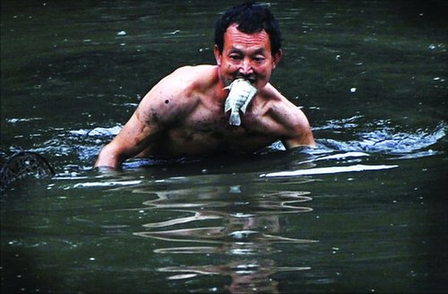 浑浊的池塘水中,无数福寿鱼浮出水面,嘴巴奋力地一张一合。十来个壮年男子站在水中,有人穿着一身衣服,有人仅着底裤;有人拿着塑料袋、竹筐上阵,有人干脆赤手空拳,瞪大眼睛,在浑水中摸鱼。他们的目标不是探手可及、几两重的福寿鱼,而是众多沉在水底、动辄几斤甚至上十斤的大鱼。水不深,但黑黑的淤泥几乎没过摸鱼者的臀部,这令他们举步维艰。(肖海坤)