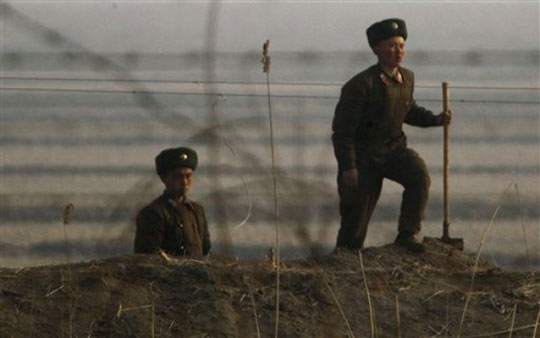 4月6日,在中朝边境,面对西方记者的镜头“骚扰”,朝鲜军人停下了手中的工作,用石子回击。