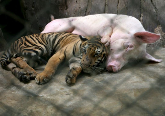中新网4月9日电 据英国媒体报道,老虎和猪共享一笼的情景并不常见,但是在泰国的一家老虎动物园里,虎猪依偎在一起互哺的温馨场面却司空见惯。据称,这家老虎园倡导混养的“欢乐家庭”模式,通常小老虎由母猪喂哺长大,老虎长大后又会哺育猪的幼崽。