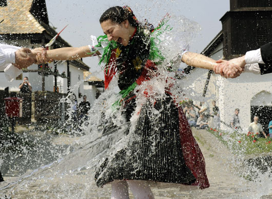 在匈牙利东北部地区,传统的迎接复活节的习俗是要向女孩身上泼水。4月9日,在布达佩斯东北部的一个小镇,当地居民演练了传统舞蹈和泼水活动,身着传统服装的男孩向女孩们身上尽情泼水。