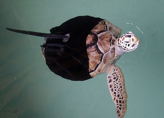 中新网4月10日电 据英国媒体报道,曾遭鲨鱼袭击失去一只鳍的绿海龟,因难以平衡,只能在水里打圈圈。日前,美国德克萨斯州海龟救助中心的科学家为它装上了一个人造“义鳍”,穿上类似马甲的“义鳍”,这只5岁的小龟终于可以和它的同伴们一起自由自在的游泳了。