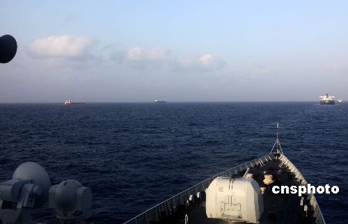 当地时间4月10日上午,中国海军舰艇编队“海口”号导弹驱逐舰伴随护航5艘商船顺利穿越亚丁湾海域,抵达曼德海峡东口,完成首批护航编队第39批次商船护航任务。