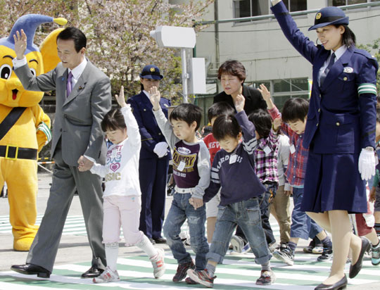 4月13日,在日本举行的交通安全宣传周活动中,首相麻生太郎亲自引领小学生走斑马线过马路,以培养小朋友们的交通安全意识。