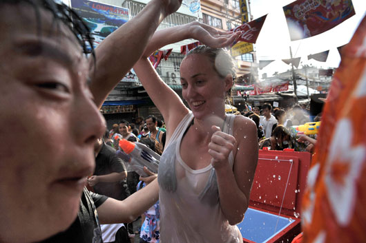 4月15日,泰国首都曼谷的居民生活恢复了正常,很多商店打开了大门,马路上又呈现出车水马龙的景象。人们开始在街头载歌载舞,相互泼水,欢庆泰国新年。4月13日至15日是泰国人最重要的传统节日“泼水节”,也是泰历新年。