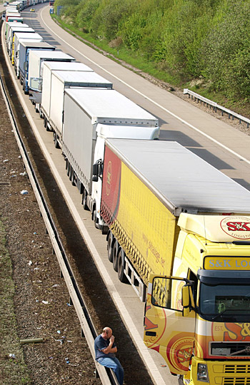 图:法国渔民封锁渡口造成车辆大拥堵(2)